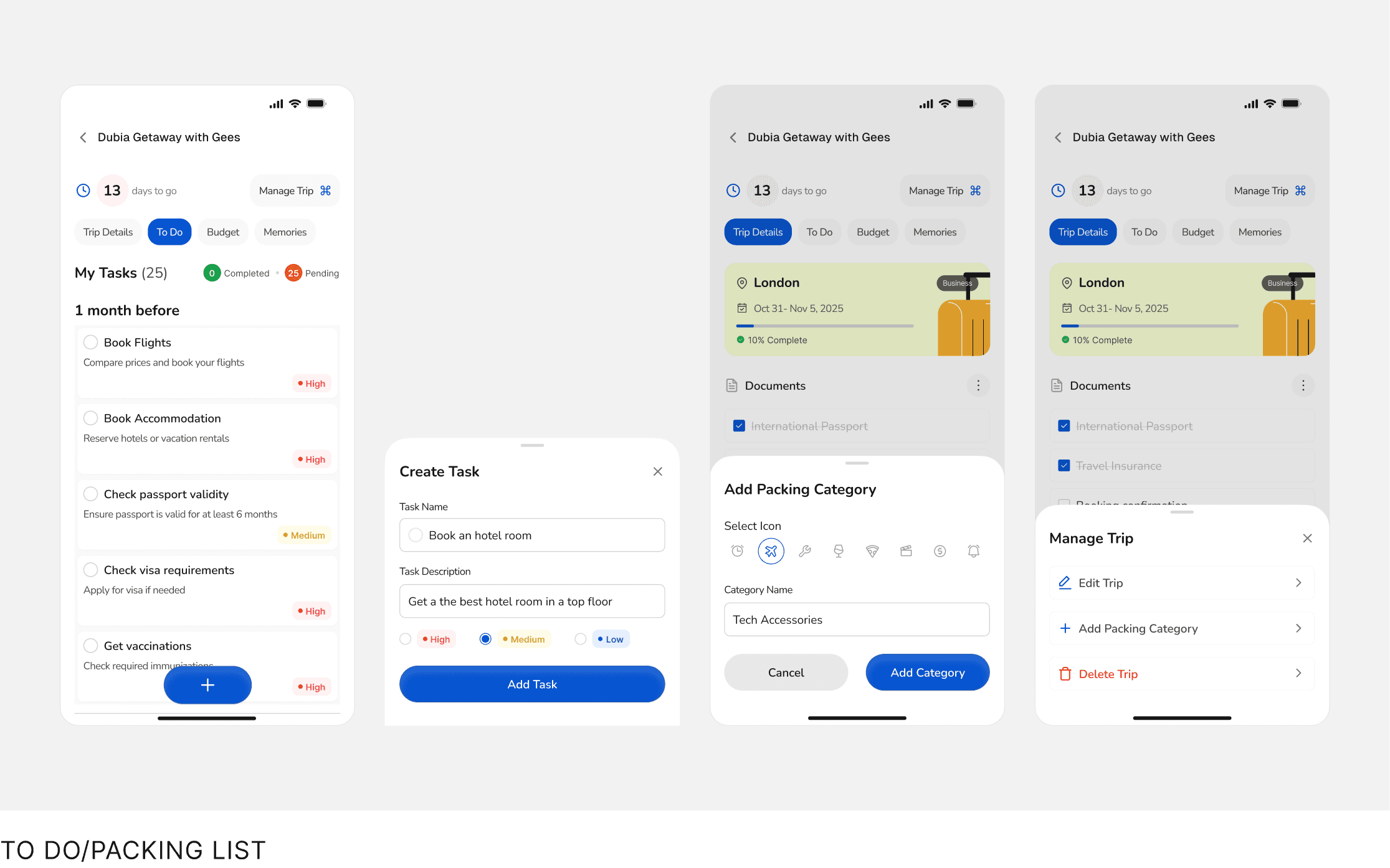 Users manage travel tasks and packing lists with reminders.