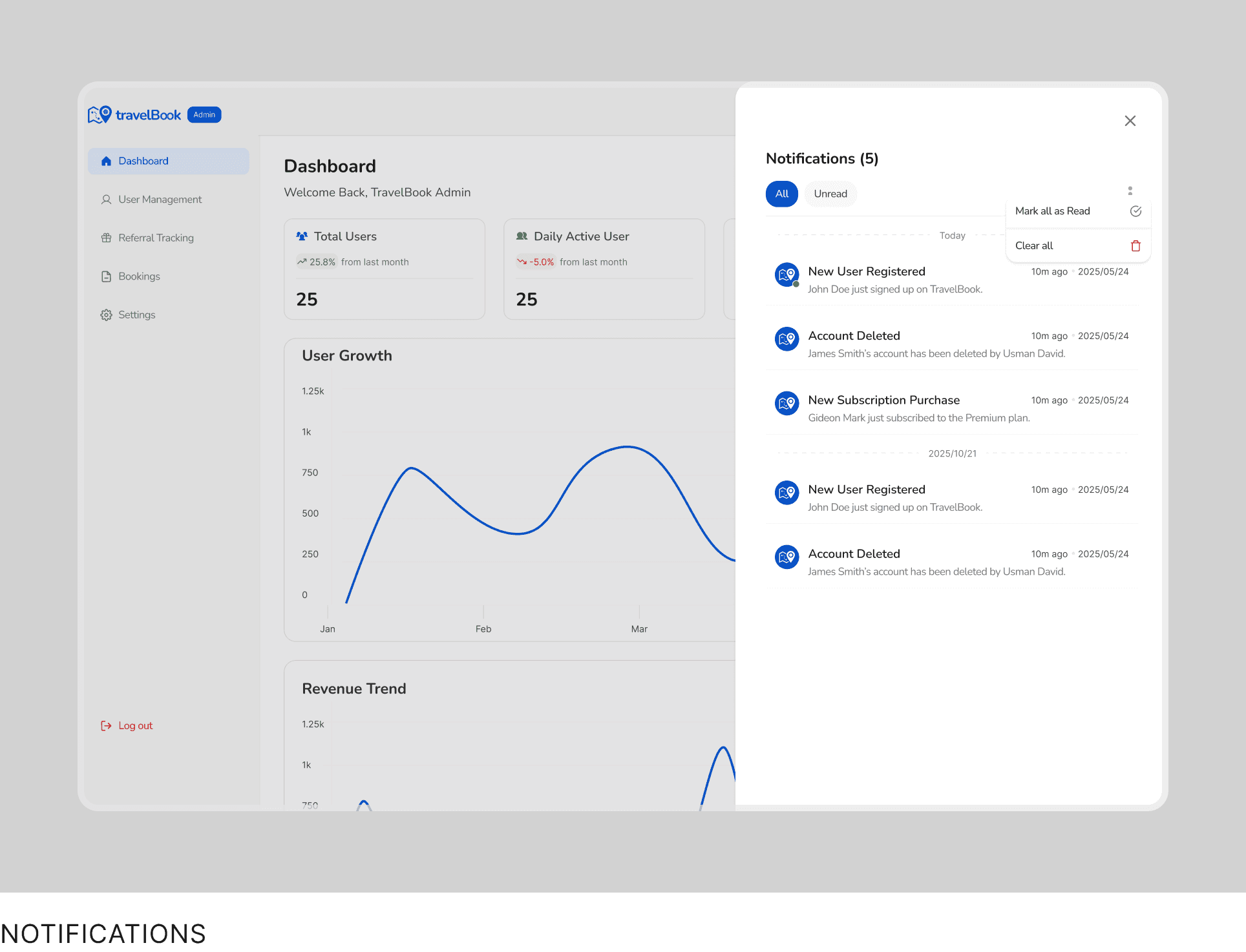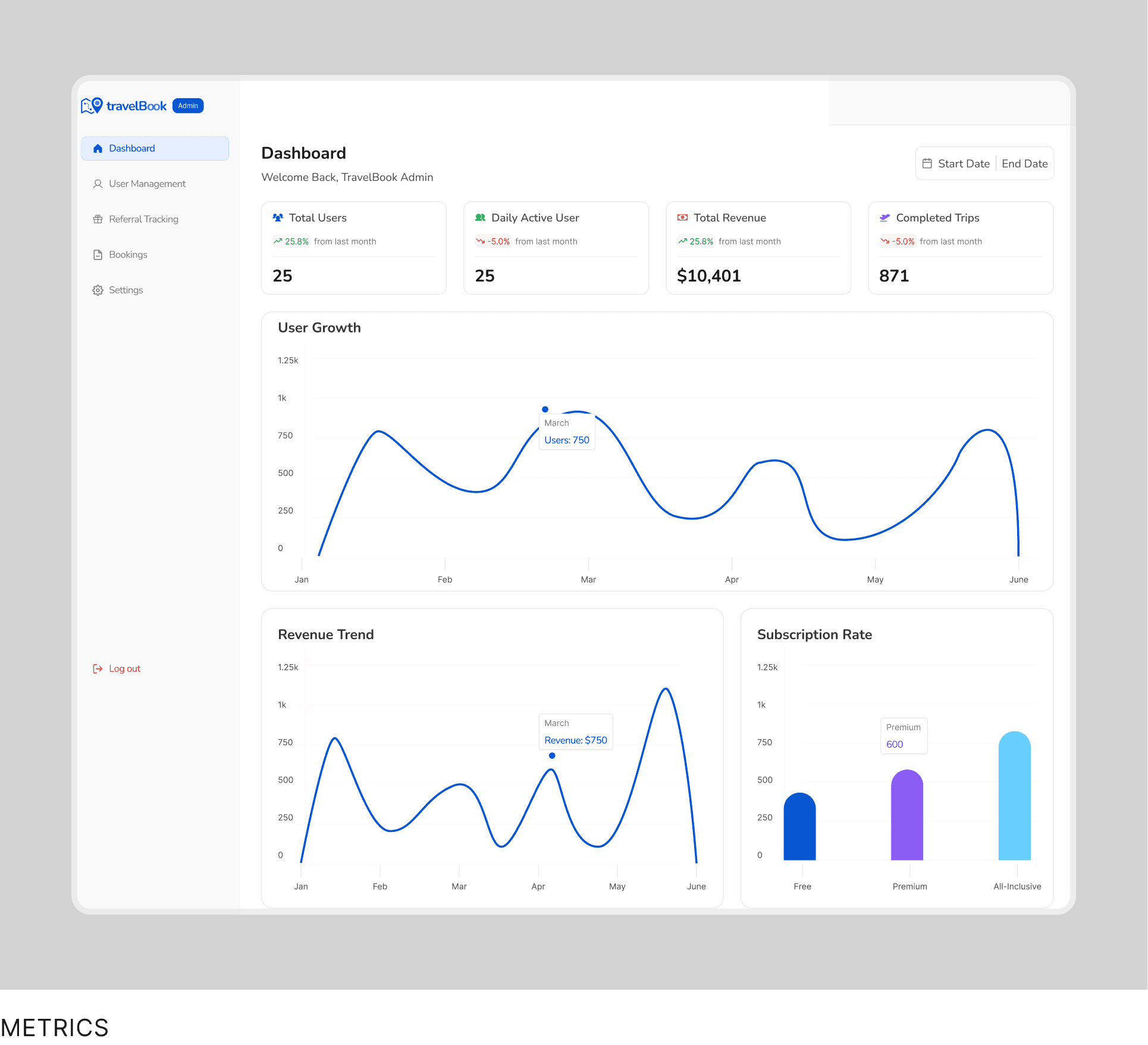 Admins view key platform metrics at a glance, including total users, user growth, revenue trends, and active subscriptions.