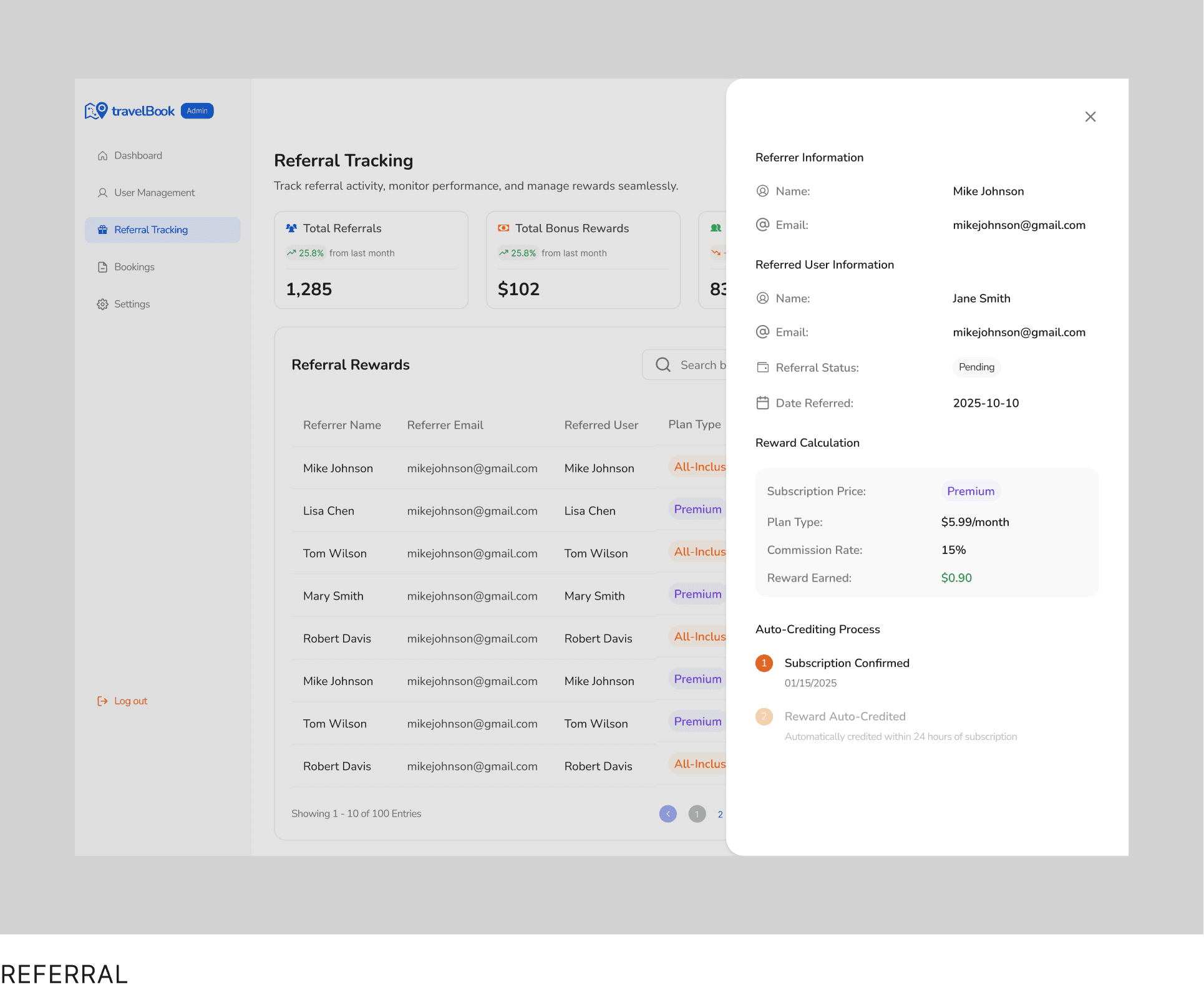 Admins track referral performance and manage the referral program. This includes referral count, total bonus rewards, referral lists, and referral settings.