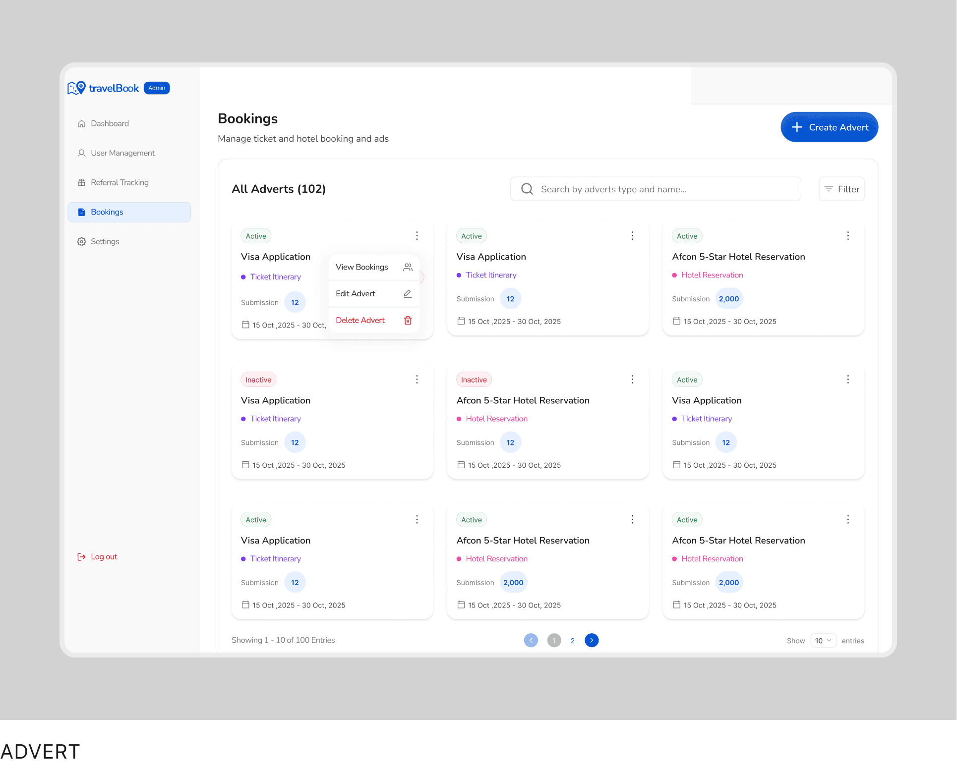 Admins create and manage adverts linked to bookings, with access to booking details and performance.