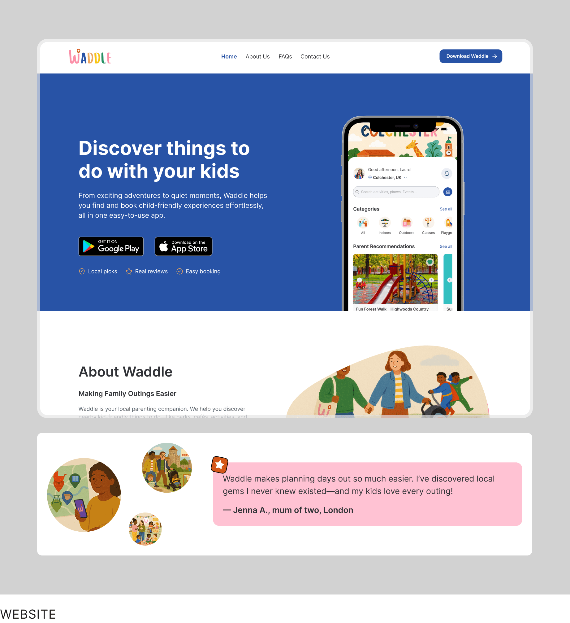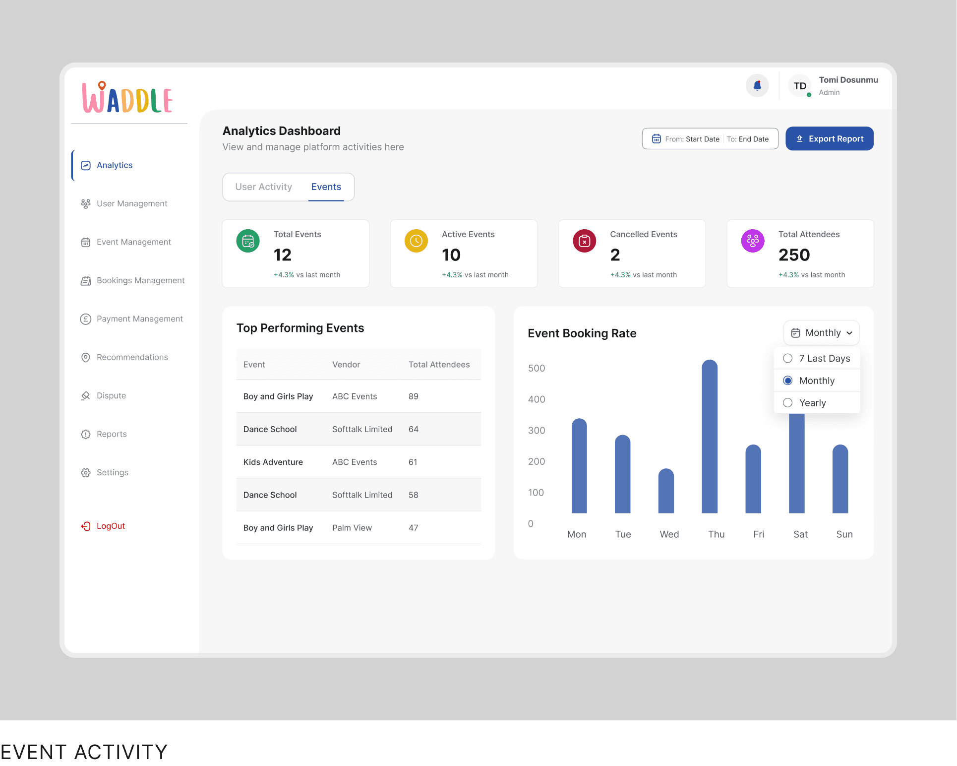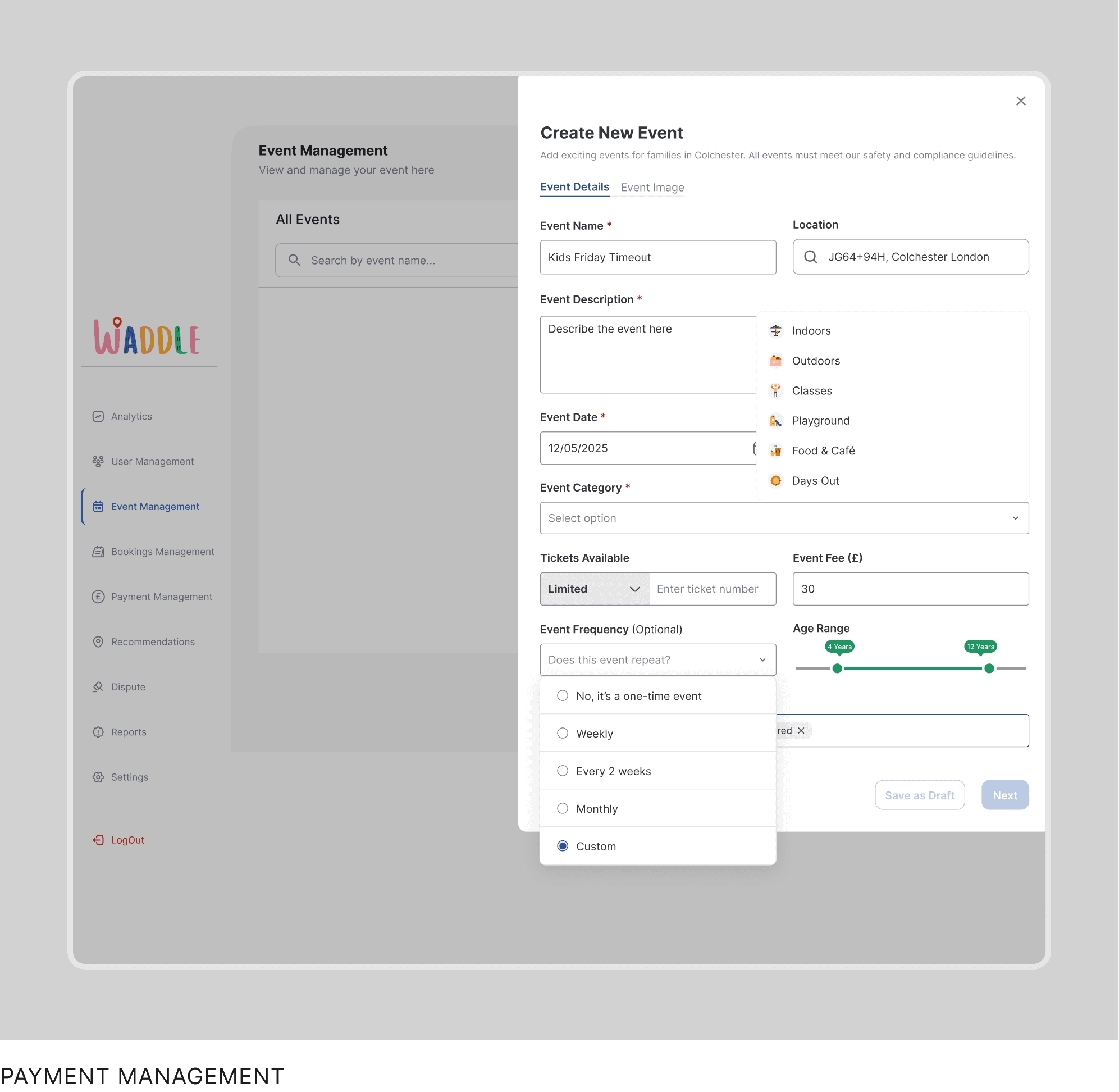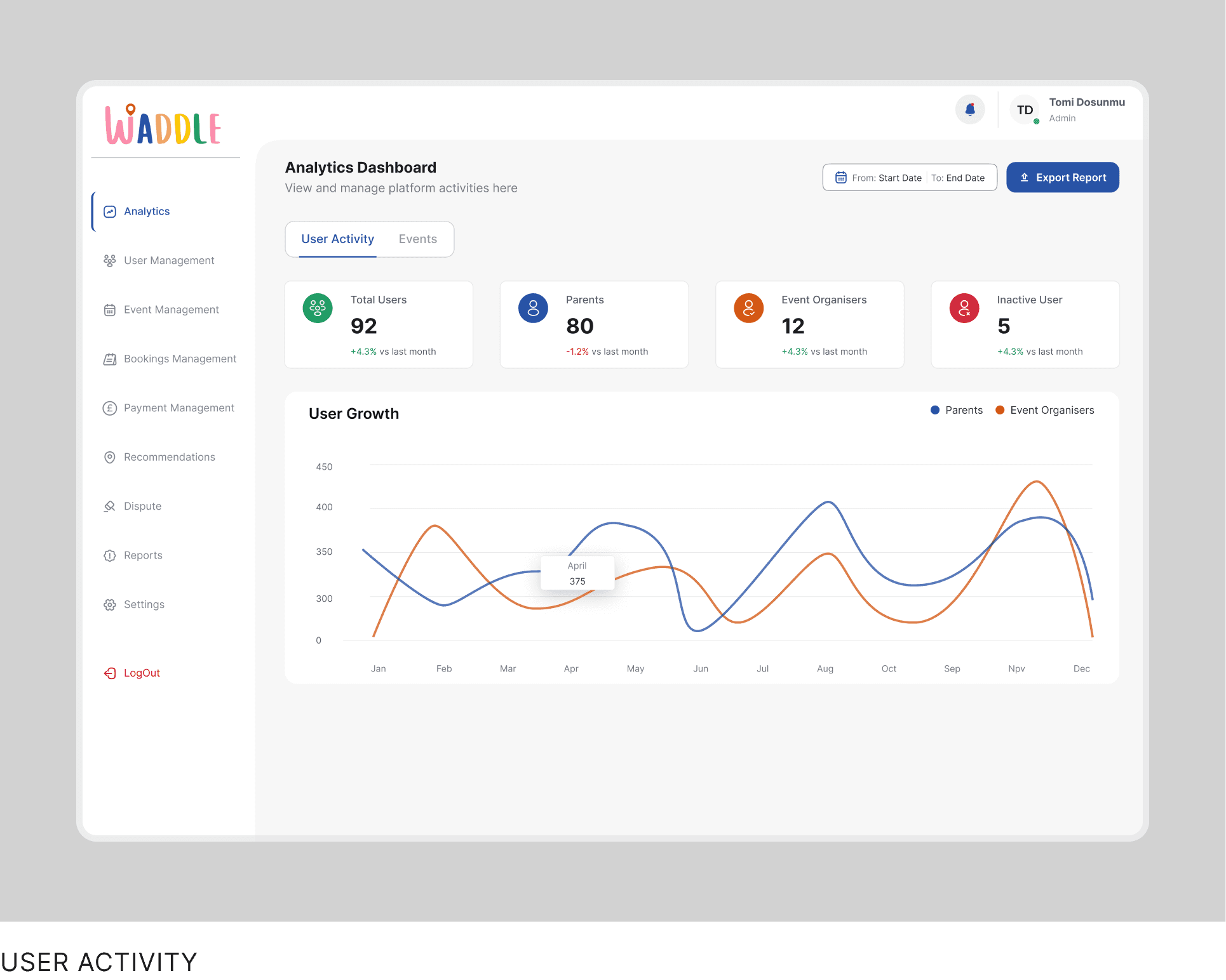Waddle is a live multi-sided platform available on iOS and Android. It connects parents with trusted events and places for children, enables event organisers to manage listings and bookings, and provides admins with tools to moderate content, resolve disputes, and manage revenue.