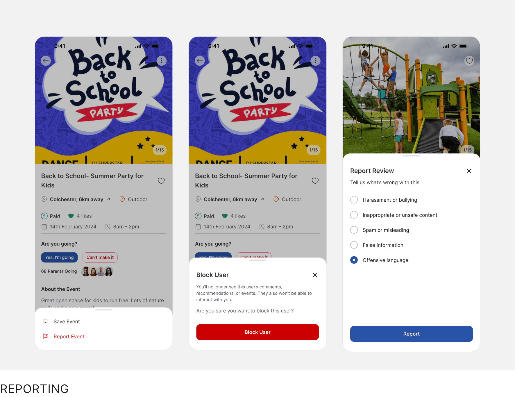 Parents can report inappropriate reviews or comments for admin action.