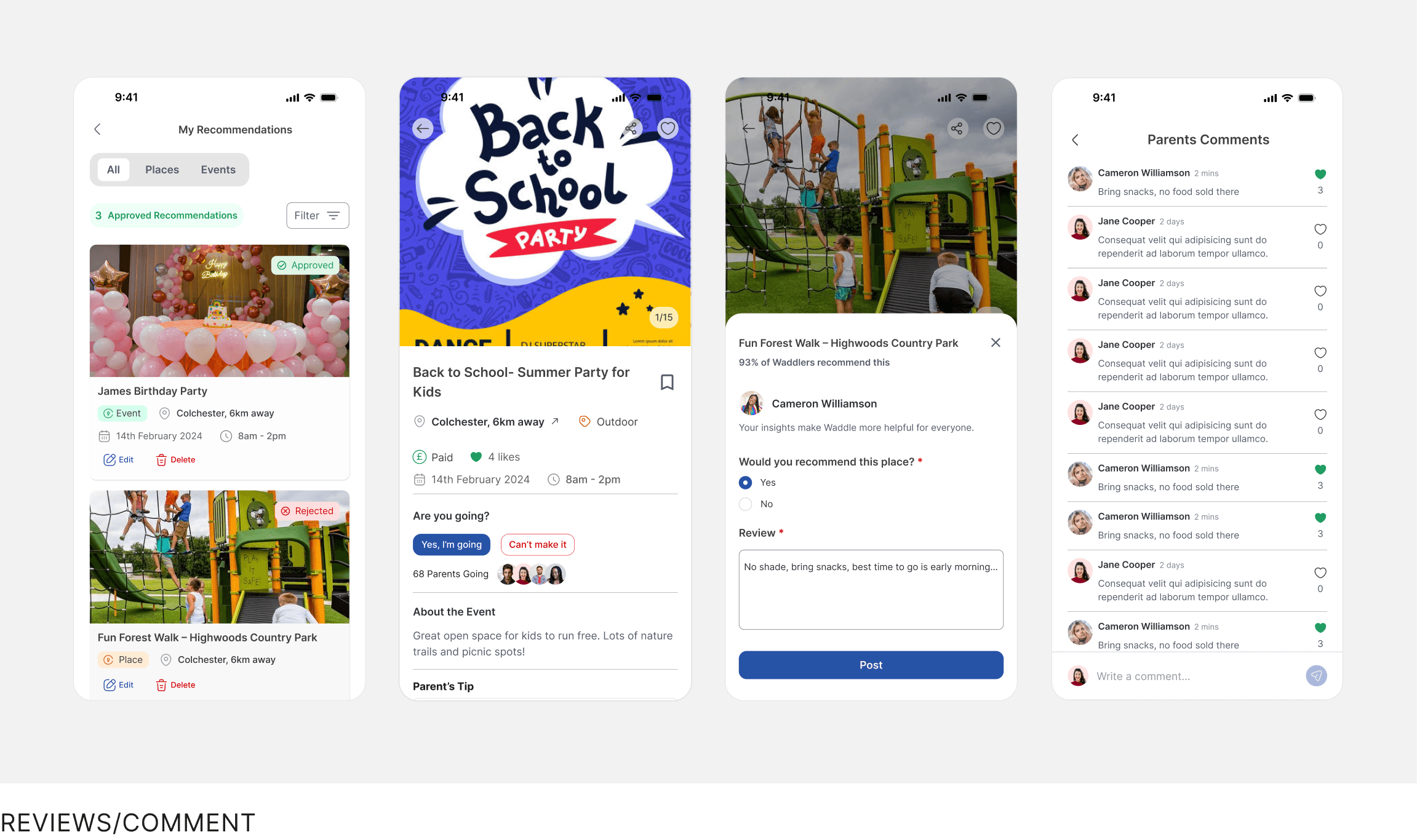 Parents can leave reviews and comments to share experiences and build trust.